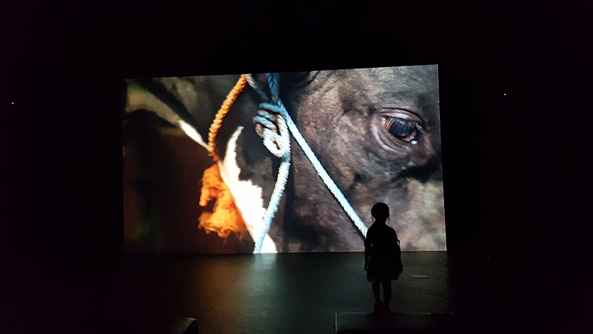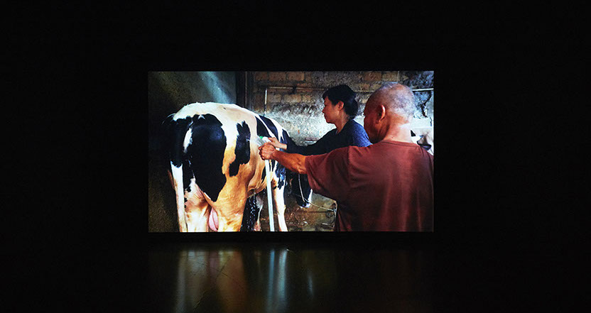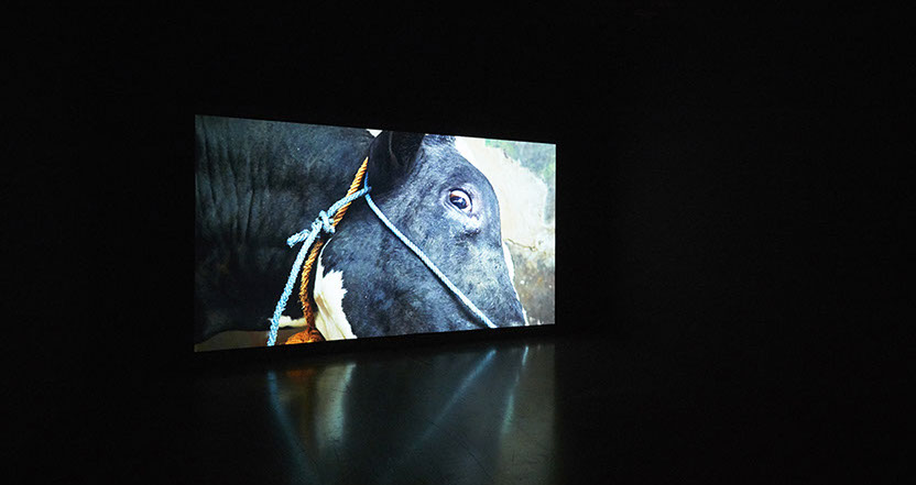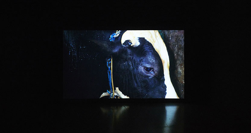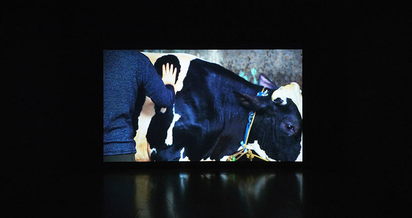 Cow Bathing for Spring Day by Eunji Cho was filmed at a farm in Jakarta, Indonesia. It captures immediate sensation of the touch against the skin of a cow with sound and video. This work of that pays a visit to the cows and baths them is a reflection on the body penetrated by an experience of violence, and a ritual about it. The action of the artist that focuses on the bodies of those who have to bear any violence from the outside with complete passivity and engages with them is a response to the remainder that is not reduced to meaning under the shadow of the institutionalized civilization. This appears as an attitude that becomes the responsibility of the others caused by unavoidable circumstances, in this case, animal. With the artist’s response, the skin of the cow becomes sound pieces, and the eyes of the cow become a representation of the unrepresentable.