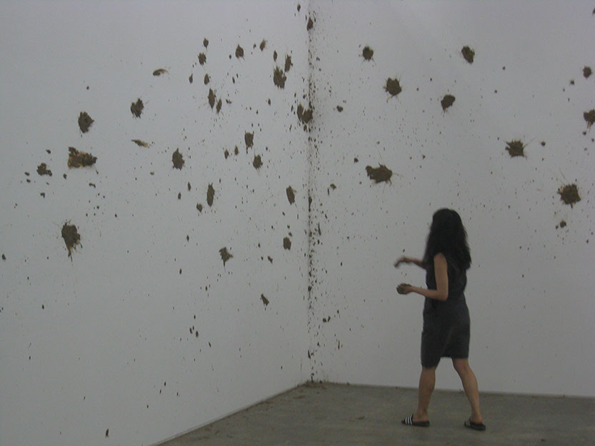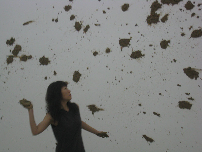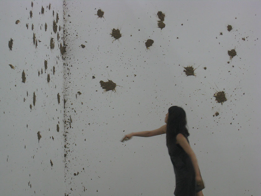 Eunji Cho explores the slippage that arises when a modern subject enters another territory and becomes a minority, a colonized, and the “other.” Elaborating the limits to preconception, ideology, boundary, and identity, Cho unravels stories about the “others,” be it herself or other individuals. The fragile, unstable structure of her narrative opens up the space for constant changes and shifts, her method of execution itself slipping from the still present rigid, disciplinary definition of art in her use of music, performance, conversation, symposium, and more. For the 7th Gwangju Biennale, Cho’s performance Mud Poem_Exodus involves throwing mud lumps at a white gallery wall. Taking a full advantage of the mud’s highly viscous and easily shapeable characteristics, Cho creates a new form of vertical land onto which a poem, written in both Korean and English, is projected and from which the text escapes freely. The exodus begins when the content of the poem migrates to an unknown territory.