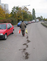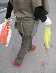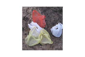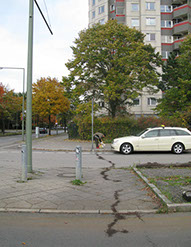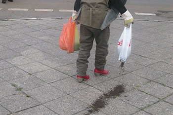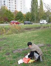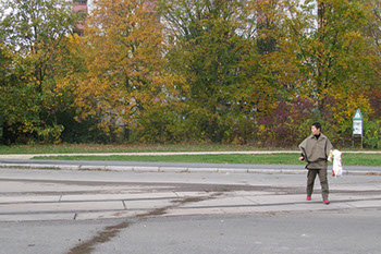 Earth Thief 2009 by Eunji Cho, a performance, here shown as video documentation, in which the artist crossed hundreds of borders within the city of Berlin—some visible and active, others (like that of the Berlin Wall) now defunct. During her circular trip, she dragged a bag of dirt be- hind her, filling it with soil from different parks or plant beds and then letting it leak out as she walked. Connecting this work to her personal history, Cho, who was born in South Korea in the 1970s, explains, “The line is always in my mind,” referring to the border between North and South Korea. Her act of fertilizing areas of the city can be seen as an act of renewal: a free-form artistic re-zoning, where old borders are erased or muddled with new lines created in her wake.