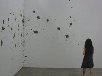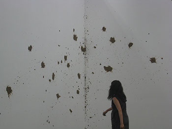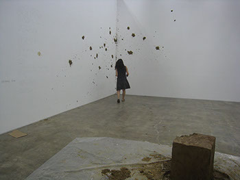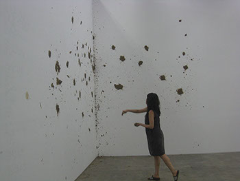 Eunji Cho explores the slippage that arises when a modern subject enters another territory and becomes a minority, a colonized, and the “other.” Elaborating the limits to preconception, ideology, boundary, and identity, Cho unravels stories about the “others,” be it herself or other individuals. The fragile, unstable structure of her narrative opens up the space for constant changes and shifts, her method of execution itself slipping from the still present rigid, disciplinary definition of art in her use of music, performance, conversation, symposium, and more. For the 7th Gwangju Biennale, Cho’s performance Mud Poem_Exodus involves throwing mud lumps at a white gallery wall. Taking a full advantage of the mud’s highly viscous and easily shapeable characteristics, Cho creates a new form of vertical land onto which a poem, written in both Korean and English, is projected and from which the text escapes freely. The exodus begins when the content of the poem migrates to an unknown territory.