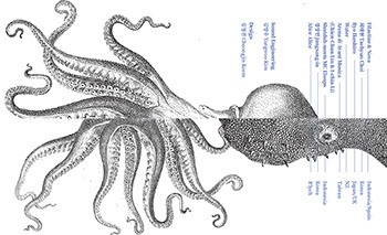Did we give you a totally refreshing topic for your chattering and fellowship? Are you now able to show off your knowledge through the octopus? You probably don’t even care at all if the octopus is a genuine story or a subject of wrath, because there’s pure joy in putting the octopus on the cutting board, and cooking it this way and that. Your fellowship becomes complete, knowledge is shared, and going on further, you near power, the power of the progressive. The life of the octopus means nothing to you, for whom social progress is more important than things with life. That’s right. Such a thing as social progress never caters to something so insignificant as such living organisms. But do remember. You never want to admit the fact that, with every step you take towards justice and progress, the vulgar and insignificant lives that support your noble life are being trampled on over. Why? Because you’re an important person who needs to lead justice and progress. But what’s even more important than that in this world? What isn’t important? I will no longer open up my heart to people like you, because the octopus will eventually become complete through language. While you analyze, investigate and prove what is octopus and what is venting out, and while you try to teach and solve it, the octopus thinks. It realizes that it’s time to disappear. Now. It’s starting to get ready to leave.