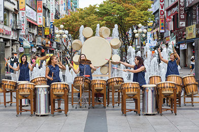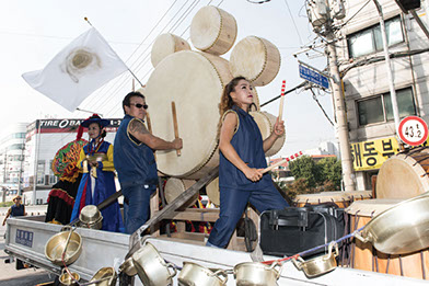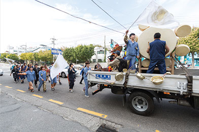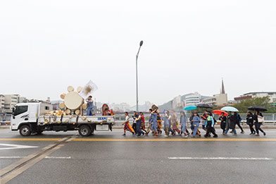 Parade (The Sun Swims through Sweat) is a performance work with local residents and organizations parading along paths that traverse various parts of the city. For Eunji Cho, a parade is a simple act that is a bodily expression of mutual blessing of the participants; it is a moving collective and a ritual of sharing. Her project includes drum group Ta Harang, master drummer IM Sun Bin, Pyongyang Sword Dancers, public transportation workers, and students from the region. Along with these Any- ang residents, Jaranan TMBK, an Indonesian dance group from the neighboring city of Ansan will also participate in the performances. For Cho, Anyang is a place of re- membering the sun - a memory of sweltering emotion pre-dating reason, heightened sympathy, animal skins, and the old night etched in our DNA. These sentiments exist in people’s memory, where they are preserved and transformed. People convey this memory of the sun in their everyday activities and through the sweat that drips when one moves in step with the bodies of others. Cho’s Parade shares the sun that flows through this sweat as a way to celebrate daily life.