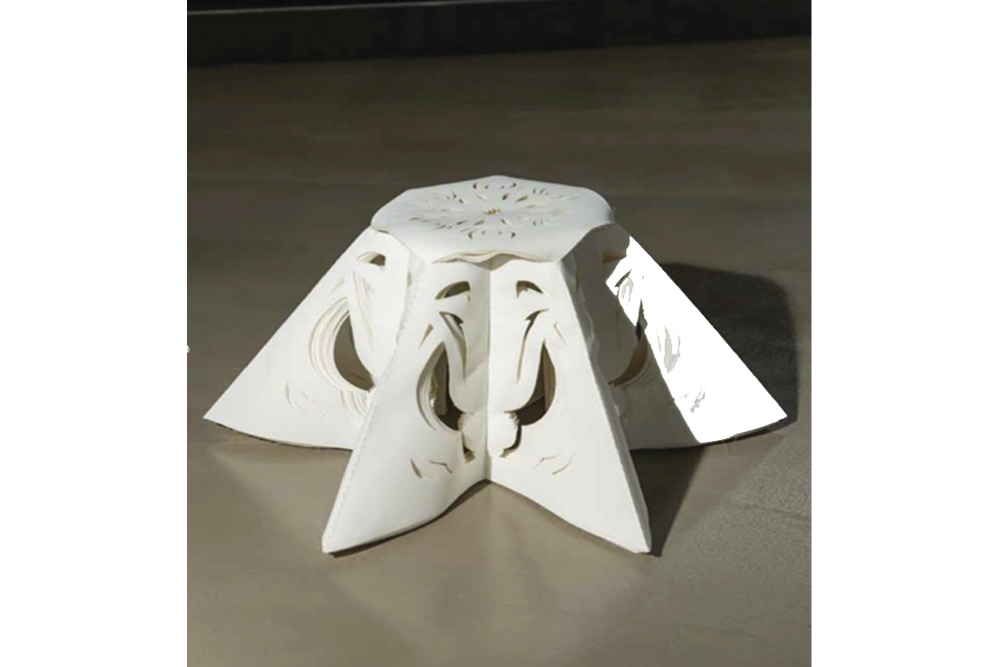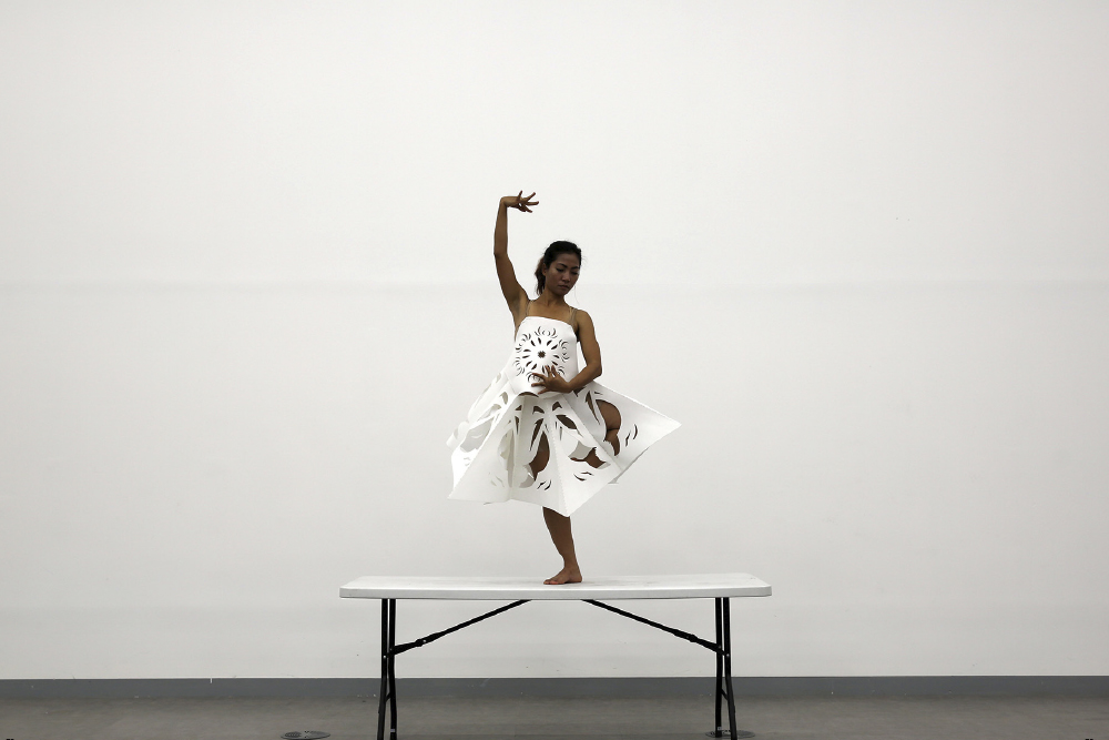 The artist studied the formative patterns of imaginary flowers, schematized the floral patterns for the performer’s costume and choreographed her movements. Jihwa, gime, and sulwisulkyung (paper craft used in traditional Korean shamanistic ceremonies) were researched to identify the formative patterns of imaginary flowers and to schematize a pattern that represents eternity and reversion.