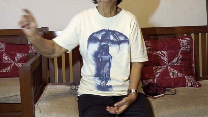 A Portrait of a Woman with a Black Umbrella 2019 is a video portrait of a body that has experienced something. This video stares at a woman named Sri Muhayati who survived the Indonesian Massacre occurred in 1965, and the image is focused on her old eyes, skin and her clothes by which it moves along. Although she continuously gives testimony to something, it is soundless except for a particular part. By focusing on one person’s body rather than exposing the narrator’s vivid story, this work enables us to respond to fully experiencing a complete stranger’s body, not simply listen to a story of the past.