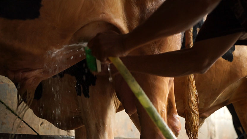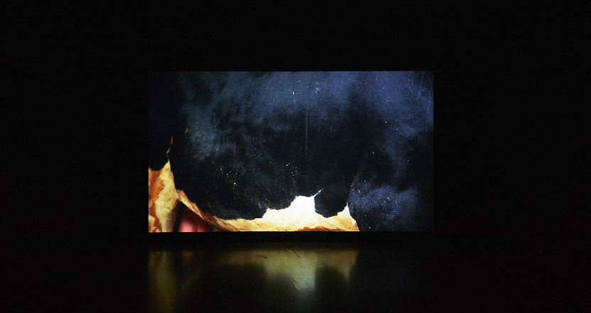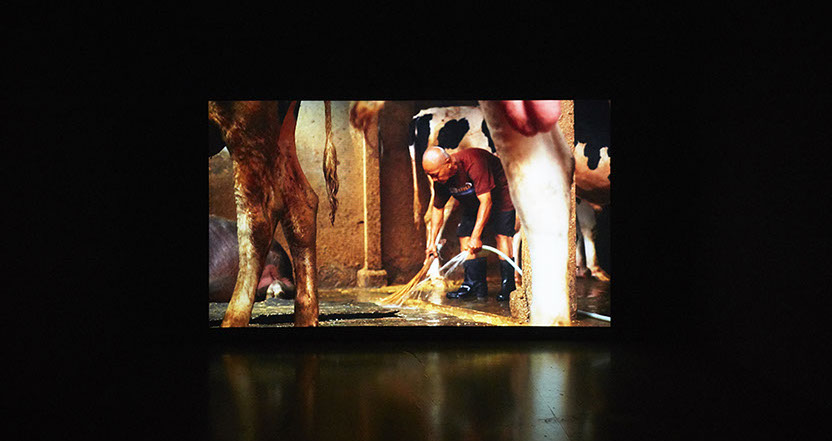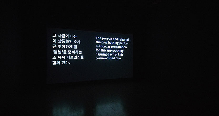 Cow Bathing for Spring Day by Eunji Cho was filmed at a farm in Jakarta, Indonesia. It captures immediate sensation of the touch against the skin of a cow with sound and video. This work of that pays a visit to the cows and baths them is a reflection on the body penetrated by an experience of violence, and a ritual about it. The action of the artist that focuses on the bodies of those who have to bear any violence from the outside with complete passivity and engages with them is a response to the remainder that is not reduced to meaning under the shadow of the institutionalized civilization. This appears as an attitude that becomes the responsibility of the others caused by unavoidable circumstances, in this case, animal. With the artist’s response, the skin of the cow becomes sound pieces, and the eyes of the cow become a representation of the unrepresentable.