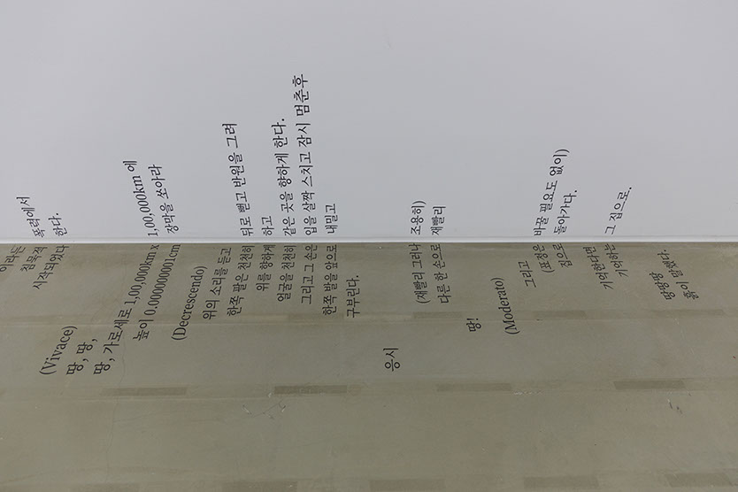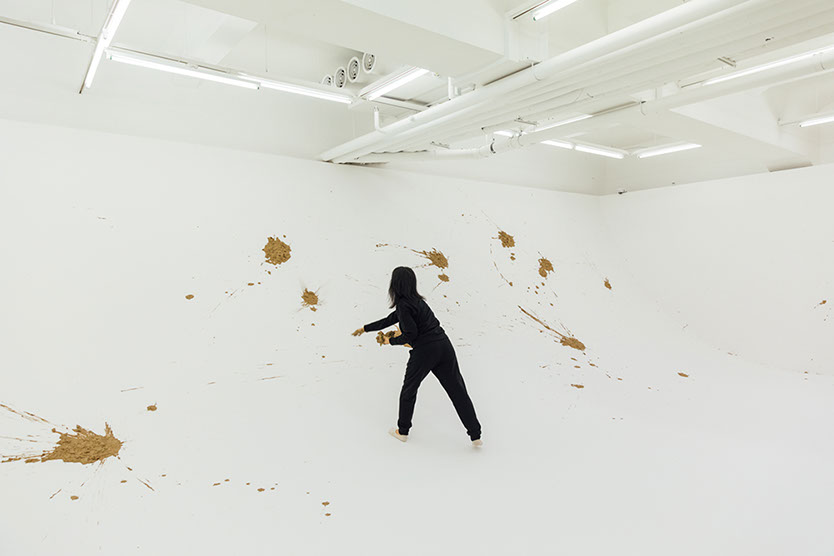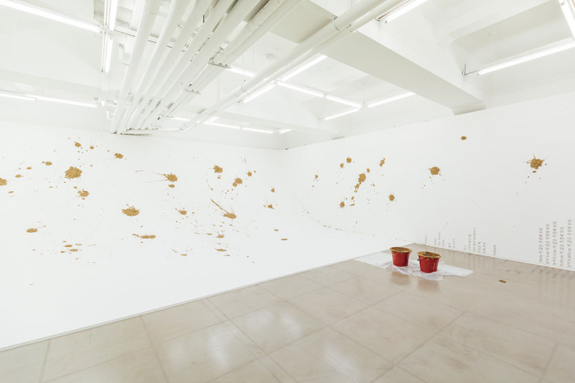 Cho Eunji’s works are centered on the experiments of resetting territory and spiritual boundaries with urban remains such as mud and dust. Cho’s works which have been focused on the “performing act of time” carried out by arts in forms of music, performance, conversation and lecture lead us to encounter an individual and the reality alienated from not only the collective violence but also the collectivization of the violent memories through intermediate space that constantly moves and changes. ‘Dtang’, The Mud Said 2019 was first performed at the National Theater of Korea in 2011, and this is the third version of performance installation work following Dtang performed at Dusseldorf in 2012. The act of throwing mud toward the wall and the sound of “Dtang” resonates at the moment create a powerful moment of experience. For the performance in Dusseldorf, a musical piece that the music director Peter Gahn produced, inspired by Cho’s mud throwing performance, was played with the artist’s narration, clarinet, cello, and piano. The sound she makes while she throws mud on the wall is the sound of gunfire and the performer’s body itself that penetrates the wall.