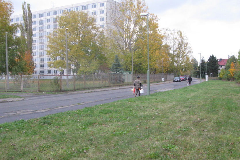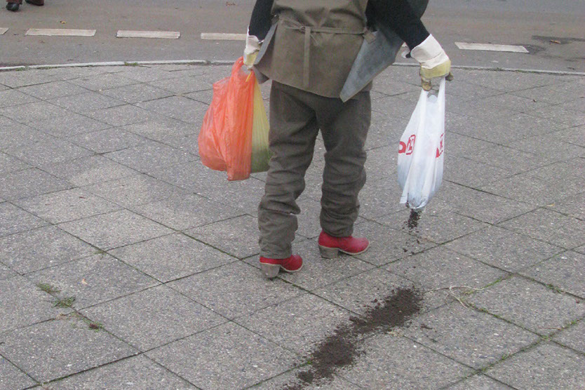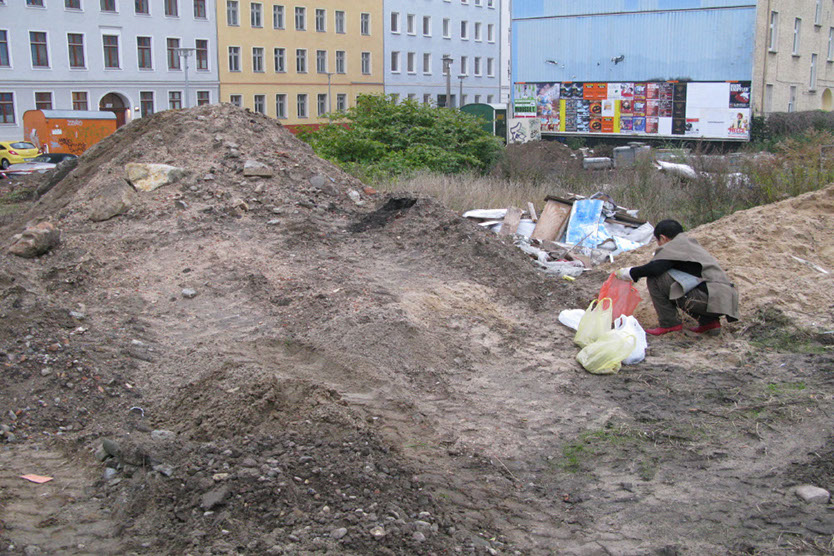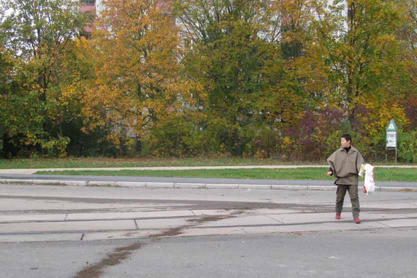 Earth Thief 2009 by Eunji Cho, a performance, here shown as video documentation, in which the artist crossed hundreds of borders within the city of Berlin—some visible and active, others (like that of the Berlin Wall) now defunct. During her circular trip, she dragged a bag of dirt be- hind her, filling it with soil from different parks or plant beds and then letting it leak out as she walked. Connecting this work to her personal history, Cho, who was born in South Korea in the 1970s, explains, “The line is always in my mind,” referring to the border between North and South Korea. Her act of fertilizing areas of the city can be seen as an act of renewal: a free-form artistic re-zoning, where old borders are erased or muddled with new lines created in her wake.