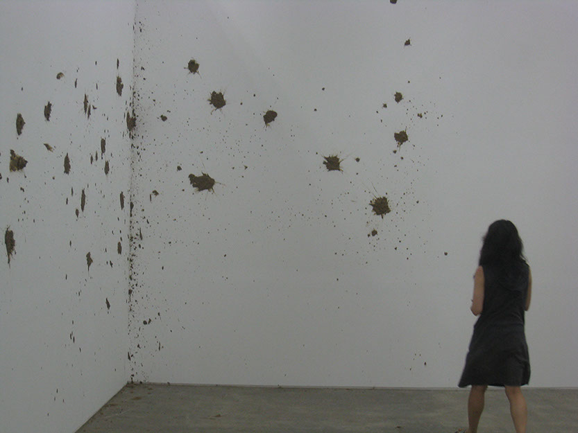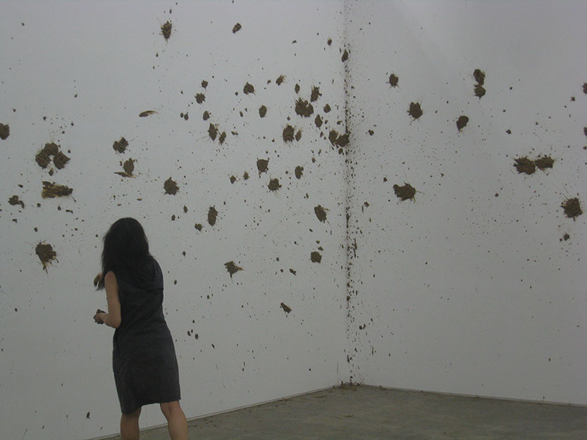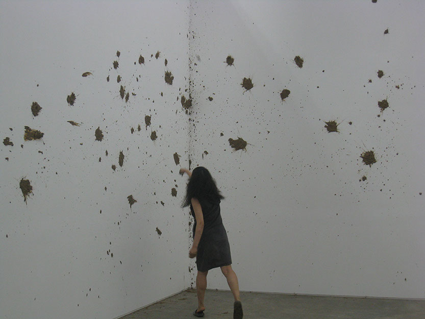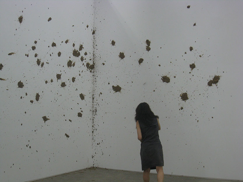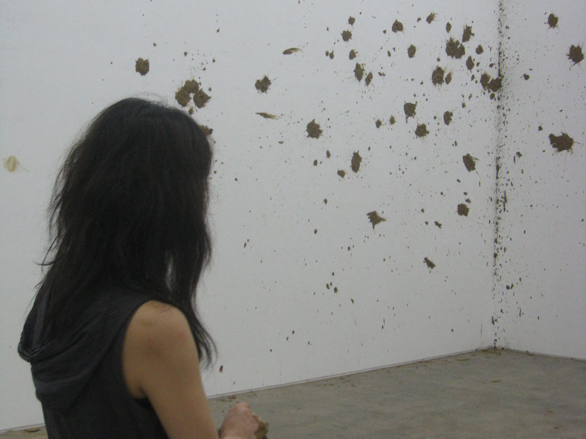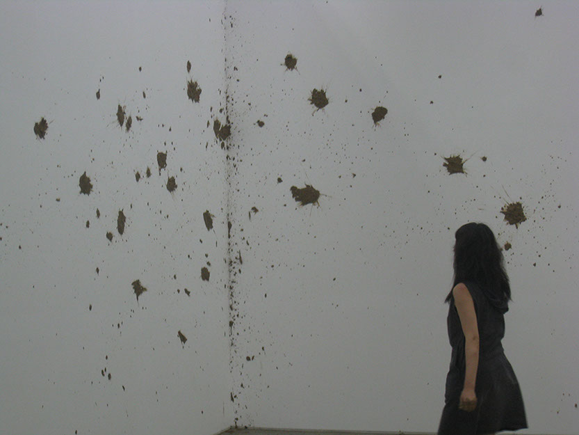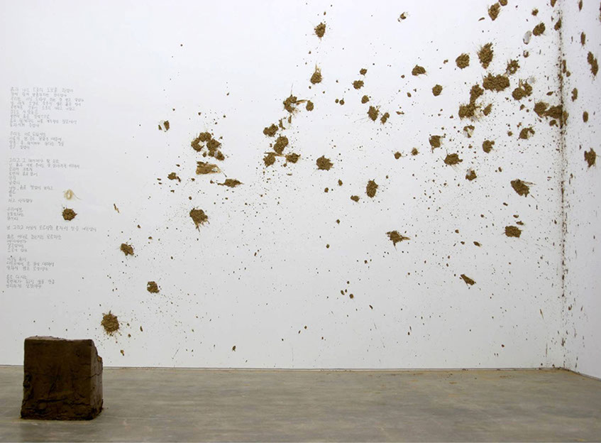 Eunji Cho explores the slippage that arises when a modern subject enters another territory and becomes a minority, a colonized, and the “other.” Elaborating the limits to preconception, ideology, boundary, and identity, Cho unravels stories about the “others,” be it herself or other individuals. The fragile, unstable structure of her narrative opens up the space for constant changes and shifts, her method of execution itself slipping from the still present rigid, disciplinary definition of art in her use of music, performance, conversation, symposium, and more. For the 7th Gwangju Biennale, Cho’s performance Mud Poem_Exodus involves throwing mud lumps at a white gallery wall. Taking a full advantage of the mud’s highly viscous and easily shapeable characteristics, Cho creates a new form of vertical land onto which a poem, written in both Korean and English, is projected and from which the text escapes freely. The exodus begins when the content of the poem migrates to an unknown territory.