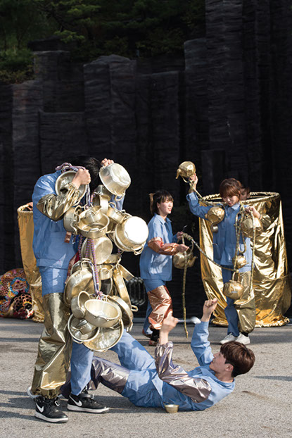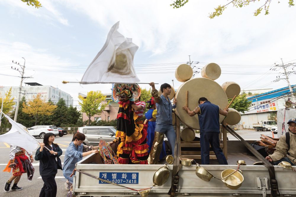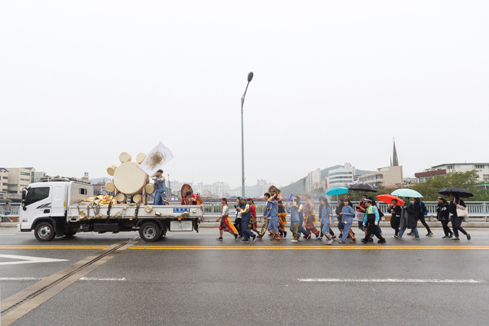 Parade (The Sun Swims through Sweat) is a performance work with local residents and organizations parading along paths that traverse various parts of the city. For Eunji Cho, a parade is a simple act that is a bodily expression of mutual blessing of the participants; it is a moving collective and a ritual of sharing. Her project includes drum group Ta Harang, master drummer IM Sun Bin, Pyongyang Sword Dancers, public transportation workers, and students from the region. Along with these Any- ang residents, Jaranan TMBK, an Indonesian dance group from the neighboring city of Ansan will also participate in the performances. For Cho, Anyang is a place of re- membering the sun - a memory of sweltering emotion pre-dating reason, heightened sympathy, animal skins, and the old night etched in our DNA. These sentiments exist in people’s memory, where they are preserved and transformed. People convey this memory of the sun in their everyday activities and through the sweat that drips when one moves in step with the bodies of others. Cho’s Parade shares the sun that flows through this sweat as a way to celebrate daily life.