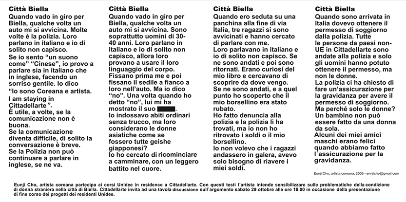 Round table discussion about Foreign women’s condition based on 4episods which the artist experienced during her artist residency in Italy.