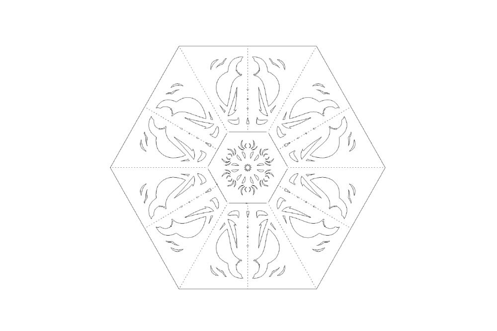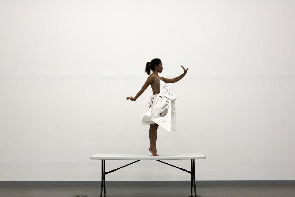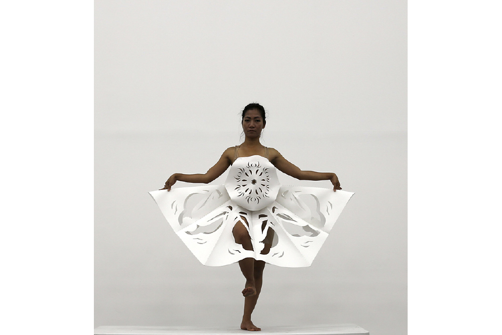 The artist studied the formative patterns of imaginary flowers, schematized the floral patterns for the performer’s costume and choreographed her movements. Jihwa, gime, and sulwisulkyung (paper craft used in traditional Korean shamanistic ceremonies) were researched to identify the formative patterns of imaginary flowers and to schematize a pattern that represents eternity and reversion.